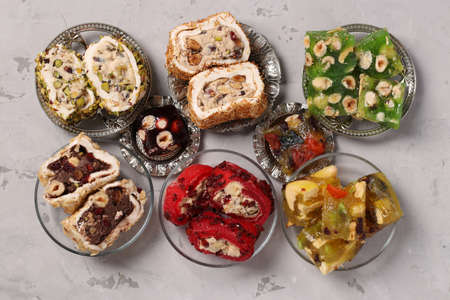 Traditional Turkish delight. Celebration of Ramadan Kareem. Arabic cuisine. A collection of traditional Turkish desserts. Close-up view from above