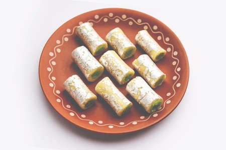 Kaju Pista Roll Or Cashew Pistachio Rolls Mithai or sigar, Indian sweet or dessert for festivals