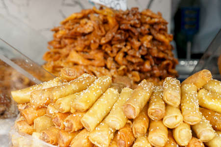 Close up view of tunisian traditional desserts in a marketplace in Sousse