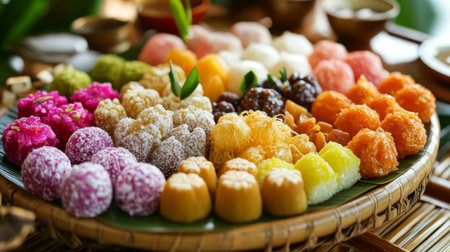 A beautiful display of traditional Asian desserts showcases bright colors and textures, perfect for cultural celebrations or sweet treats at gatherings.