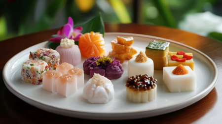 A beautiful assortment of traditional Asian desserts arranged on a decorative plate, adorned with vibrant edible flowers and green leaves, showcasing culinary artistry.