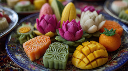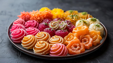 A stunning display of vibrant and intricately designed traditional snacks showcases artistic craftsmanship and celebrates culinary culture. Bright colors and elegant shapes draw attention.