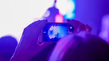 A person taking photo or video with his smartphone during a concert or a performance.