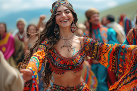 A vibrant scene showcasing enthusiastic dancers wearing colorful traditional costumes. Their joyful expressions reflect cultural celebration and artistic heritage.