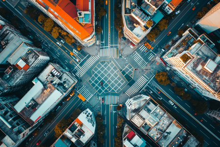 Capture the essence of urban life with this stunning aerial view showcasing a busy city intersection adorned with vibrant fall foliage and bustling streets.