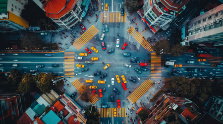 Aerial view showcasing a bustling city intersection filled with vehicles and pedestrians,.