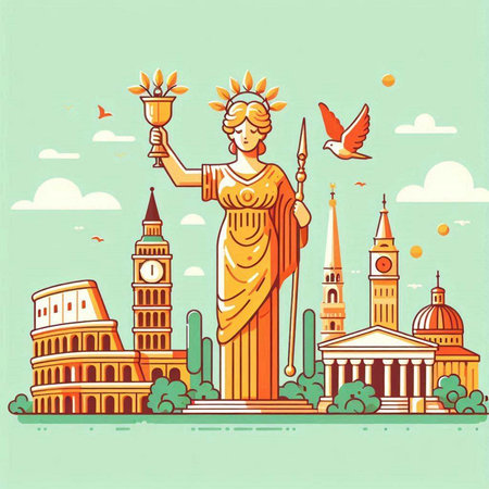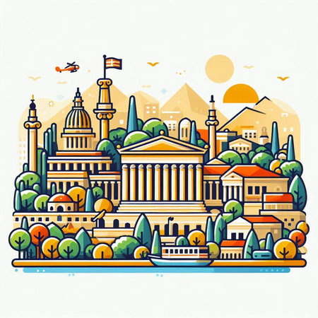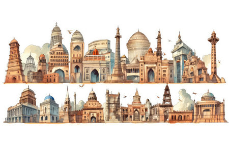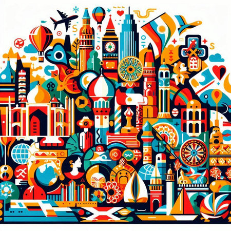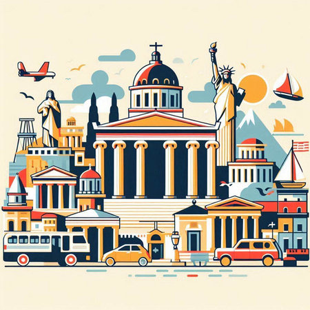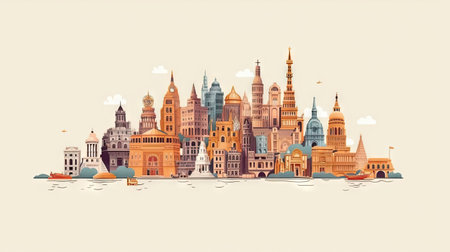 Vibrant illustration showcasing a diverse skyline of cultural and religious buildings in flat design. Captures heritage and modern influences artistically.