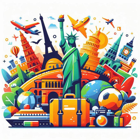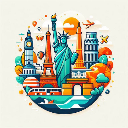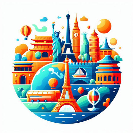 Travel around the world concept with famous monuments and landmarks. Vector illustration
