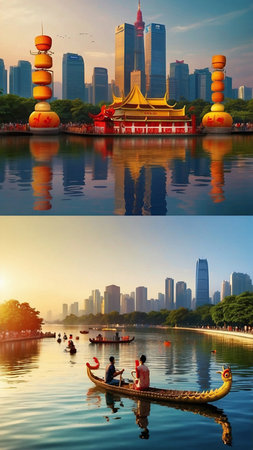 Dragon Boat Festival - Guangzhou Tower During the Festival, colorful Dragon Boats Racing on the River and People