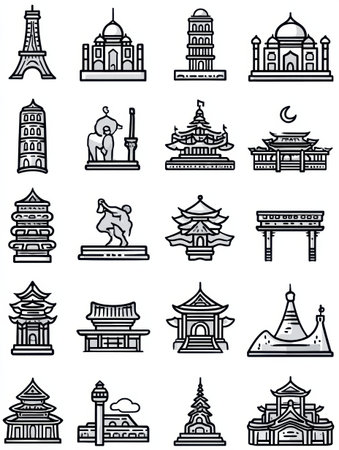 Line drawings showcase iconic cultural landmarks like towers, temples, and palaces against a simple backdrop.