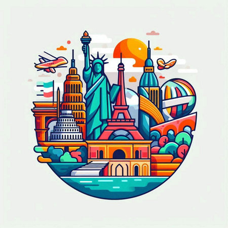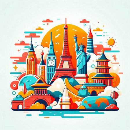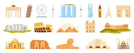 A global set of world-famous landmarks including historical monuments, religious sites, modern towers, and ancient wonders. Captures iconic architecture across continents, vector illustration.