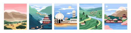 Set of landscapes. Views of tea plantations in China, Japan, Kenya, India and Sri Lanka. Sceneries of nature- meadows, fields, rivers, mountains, hills and countryside. Flat vector illustrations