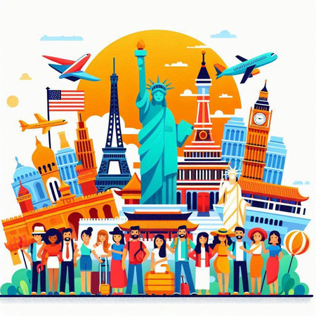 Traveling around the world concept. Tourists in front of famous landmarks. Vector illustration