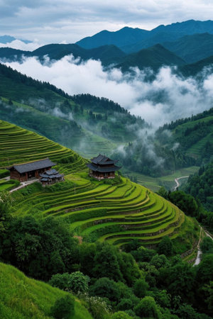 Terraced fields create striking patterns on a misty mountainside. Pine trees rise amidst the fog adding to the serene atmosphere of this tranquil rural area.