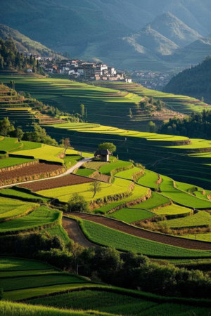 A stunning view of terraced rice fields showing vibrant green patches of farmland nestled among majestic mountains, symbolizing rural beauty and agriculture.