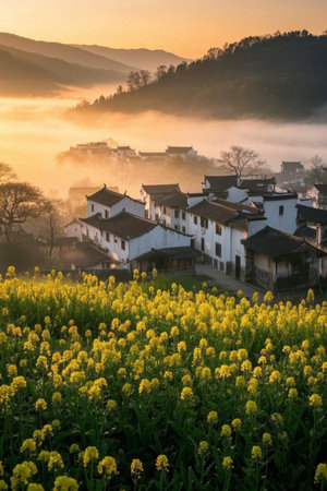 The poetic picture of the rapeseed fields in the water town, where the Huizhou architecture and the sea of golden flowers complement each other