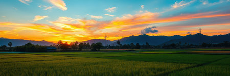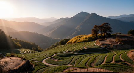 Golden rice fields on terraced hills during sunset in Asias serene landscape
