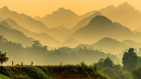 A breathtaking panoramic view of mountain ranges layered in morning mist. The warm golden light of the rising sun creates a peaceful and ethereal atmosphere.