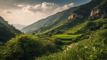 This stunning valley landscape captures the essence of nature's beauty, featuring rolling hills, lush greenery, and misty mountains under a serene sky.