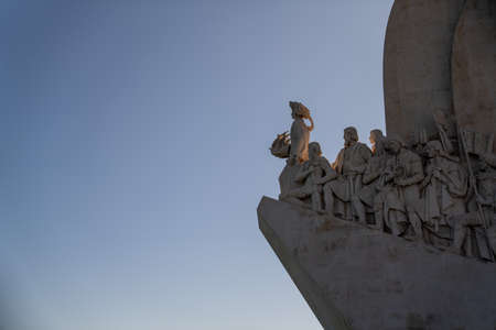 Detail at sunset of the Statues of the Monument of the Discoveries in Belem, near the Tagus River, Lisbon, Portugal
