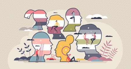 Mind behavior concept, flat tiny persons vector illustration. Abstract inner thought process and symbolic emotional activity. Personality and mental mindset types. Personal attitude and lifestyle.