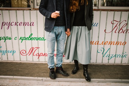 Young couple walking and hanging hands in the streets of the Czech, Prague