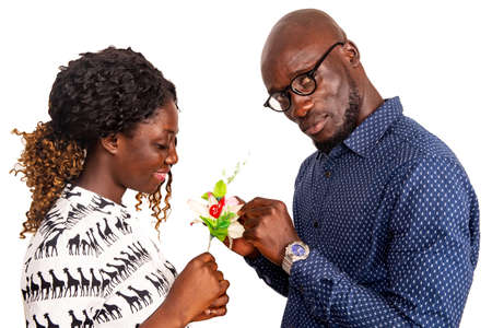 A young African couple taking a selfie on their smartphone, my shoes in traditional Sudan clothes. Selective focus.