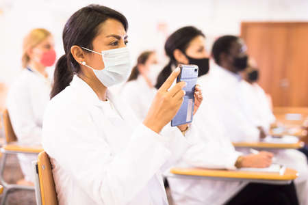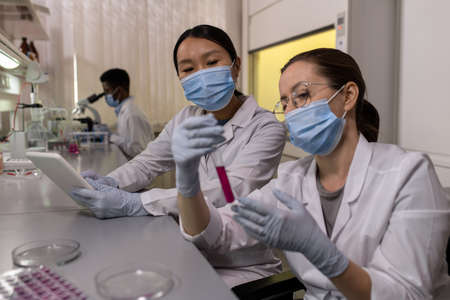 Two colleagues in protective masks examining liquid in test tube and discussing experiment together in the lab