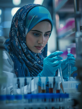 In a food science lab, a female scientist of Middle Eastern descent is diligently testing food samples using modern equipment with digital displays in a clinical, blue-toned environment