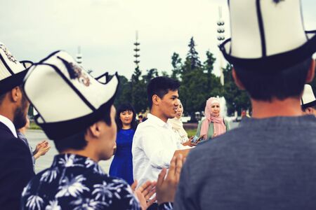 Bhairahawa, Nepal - June 5 2019: Asian Muslim devotees hugging each other and wishing Happy Eid