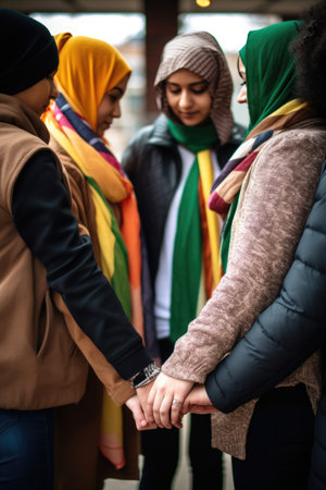 Generative AI : Multi ethnic young people team hugging together outside International community of students support and help each other Friendship team building and diversity con