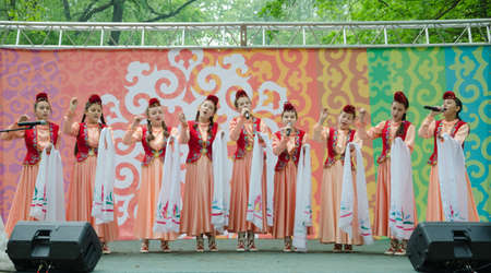 Kazan, Republic of Tatarstan, Russia - May 28, 2016: Girls in national Tatar costumes sing a song. Sabantuy (translated from Tatar - feast of the plow) is a traditional celebration of the end of spring field work.