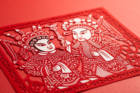 Intricate red Wayang Cina paper cutting decoration highlights the fine craftsmanship and cultural ritual tradition.