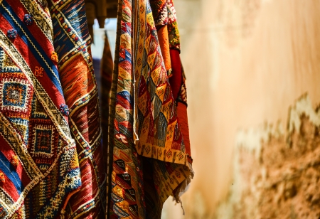 Handmade woven bedspreads in traditional Turkish style are sold at a street market