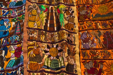 Ciudad de Guatemala, Guatemala, April, 25, 2018: Typical brightly colored handwoven Guatemalan textiles for sale by local indigenous people at an open air street market in Antigua