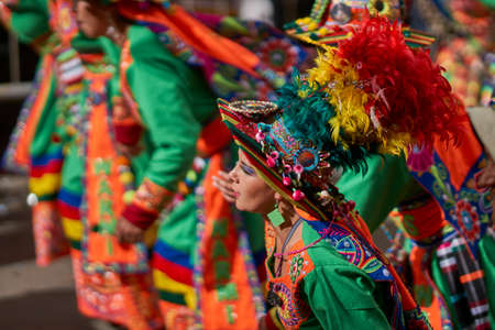 ORURO, BOLIVIA - FEBRUARY 10, 2018: Dancers at Oruro Carnival in Bolivia, declared UNESCO Cultural World Heritag on February 10, 2018 in Oruro, Bolivia
