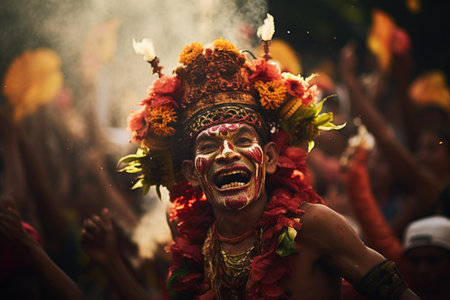 Happy and vibrant traditional festival celebration with people in cultural costumes. Face paint. And floral decorations