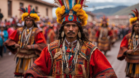 A man dressed in a native american costume. Generative AI. Inti Raymi in Cusco, Peru, festival for the Inca sun god.