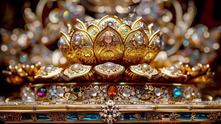 A stunning close-up view of an intricate golden lotus decoration, showcasing detailed craftsmanship, vibrant gems, and elegant design elements that symbolize beauty and luxury.