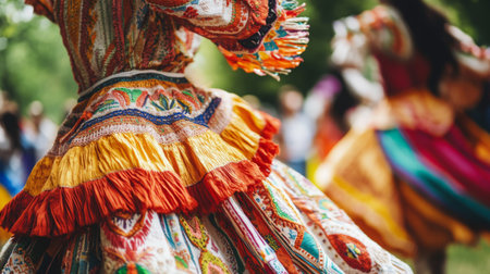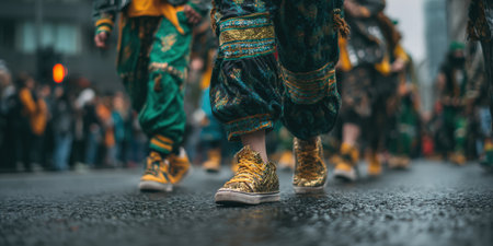 Immerse yourself in the vibrant atmosphere of a traditional cultural parade showcasing intricate costumes and unique footwear. This celebration highlights rich heritage and artistry through detailed patterns and vibrant colors.