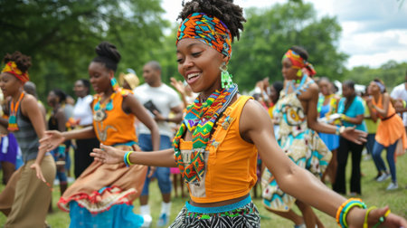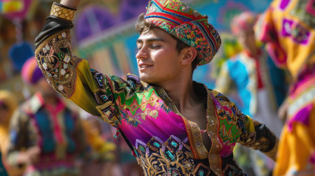 A vibrant scene showcasing enthusiastic dancers wearing colorful traditional costumes. Their joyful expressions reflect cultural celebration and artistic heritage.