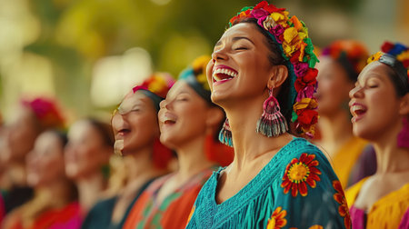 A vibrant group of female singers performing joyfully under colorful stage lights. The image captures the essence of music, culture, and celebration through powerful expressions and unity.