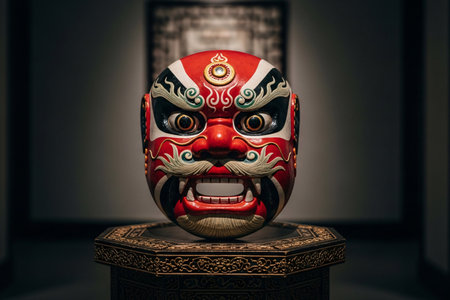 Mythical Chinese mask highly detailed and ornamental placed centrally on a dark pedestal representing eastern cultural tradition and ritual.