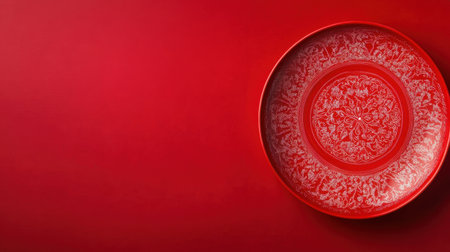 A striking red plate featuring an intricate white floral design, set against a matching red background, perfect for festive decor or artistic displays.