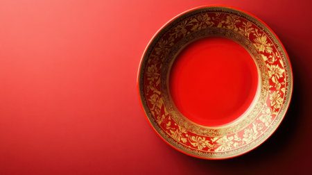 This striking red plate features intricate gold floral designs and creates a vibrant and festive atmosphere, perfect for any elegant dining occasion.