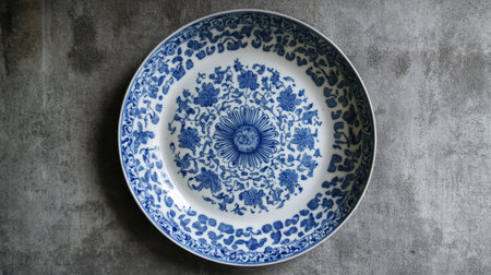 A stunning blue and white floral plate rests on a rustic table, showcasing intricate design and craftsmanship in vintage porcelain tableware, perfect for decor.