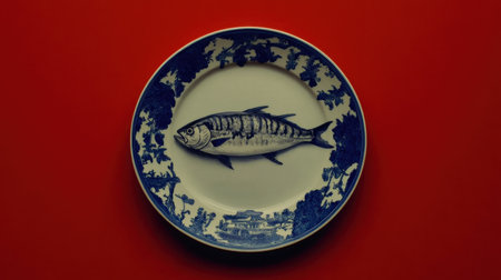 A stunning blue and white ceramic plate featuring a detailed fish illustration set against a striking red background, perfect for culinary presentations.