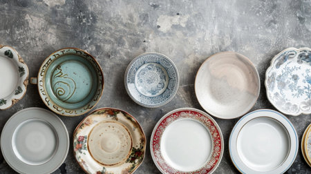 A beautiful arrangement of vintage plates showcasing various patterns and colors. Ideal for food photography, event styling, or interior design inspiration.