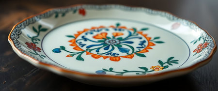 Colorful ceramic plate with floral ornament. Close-up. Select focus.