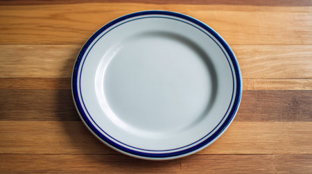 A clean, simple white plate with a blue trim, resting on a wooden table, ideal for showcasing food presentations and dining experiences.